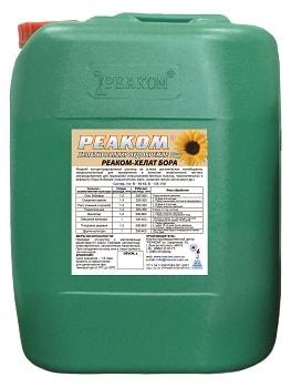 «Реаком-Хелат Бору 150» - це концентроване і екологічно чисте мікродобриво на основі органічних полиборатов. Призначений для використання в якості екологічно чистого мікродобрива для підживлення сільськогосподарських культур, чутливих до нестачі бору. Завдяки органічній формі, бор, що входить в склад мікродобрива, добре засвоюється рослинами, особливо при позакореневому підживленні.